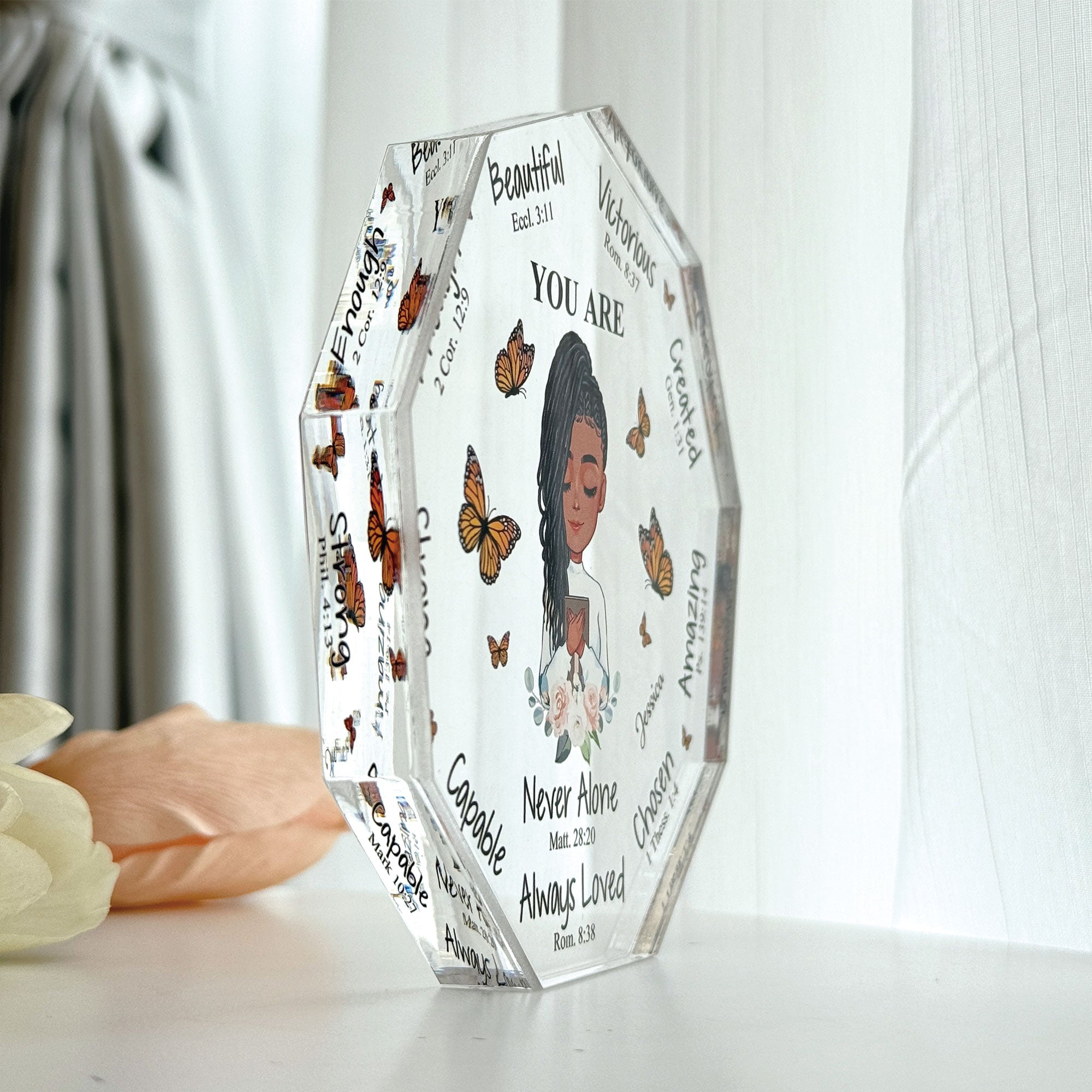 This customizable affirmation plaque is a meaningful gift designed to uplift and inspire. With beautiful clipart that can be personalized to represent your daughter, sister, or friend, this plaque also features her name and powerful affirmations, each paired with a supportive Bible verse. Words like “Strong,” “Victorious,” “Enough,” and “Always Loved” remind her of her inner strength and worth. Surrounded by delicate butterflies and floral accents, this piece is both encouraging and aesthetically pleasing. It’s an ideal gift for Christmas or any occasion where you want to show support and love. Perfect for her desk, dresser, or bedside, this affirmation plaque is a daily reminder of her value and resilience. Give the gift of positivity and confidence with a personalized touch that she’ll cherish forever!